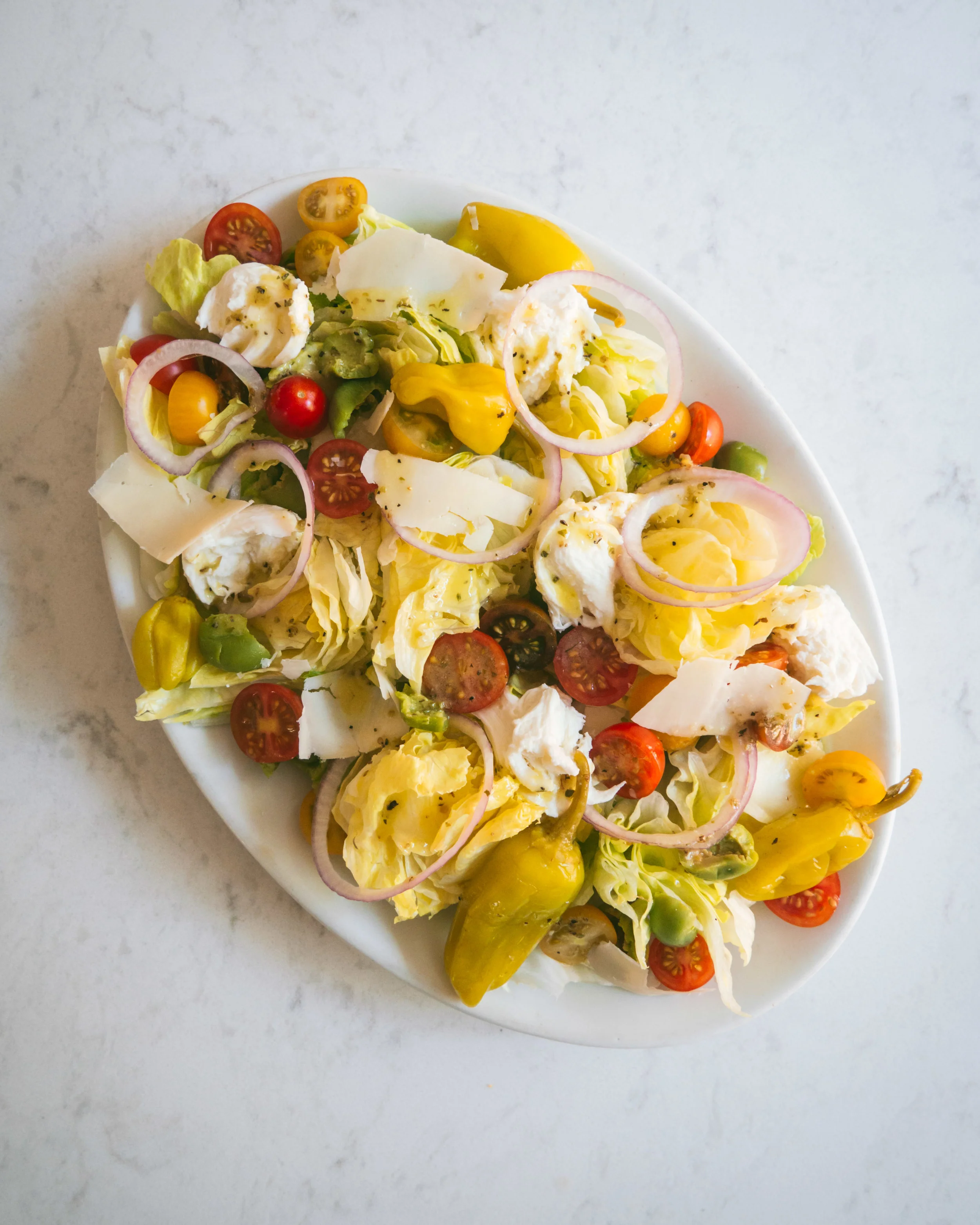 Arrange on a platter and scatter onion provolone mozzarella and peperoncini over nestling in among leaves. Drain quick pickled onions and sprinkle all over salads along with drained tomatoes discard any extracted liquid bacon toasted bread crumbs and chives. 5 tablespoons reduced fat thousand island dressing.